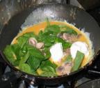 1- في مقلاة كبيرة الحجم لا يلتصق بها الطعام سخني الزيت ثم ضعي به البصل والكاري والكركم واتركي المزيج لمدة 5 دقائق ثم أضيفي له السبانخ والبقدونس والشبت والملح والفلفل وقلبي جيداً حتى يتبخر سائل السبانخ.