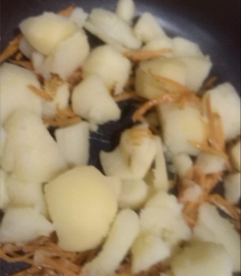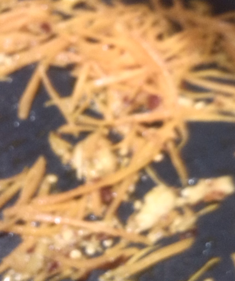 في طاووووة جزر مبشور مع بصل وفلفل احمر هندي مدقوق وفصين ثوم وزنجبيل مدقوق وعليهم زيت الزيتون اشوي حركيهم وحطي عليهم بطاطس مسلوق من اول وملح وكمون وفلفل اسود واحمر وكركم ..وحركيهم مع بعض .واهرسي البطاطس .