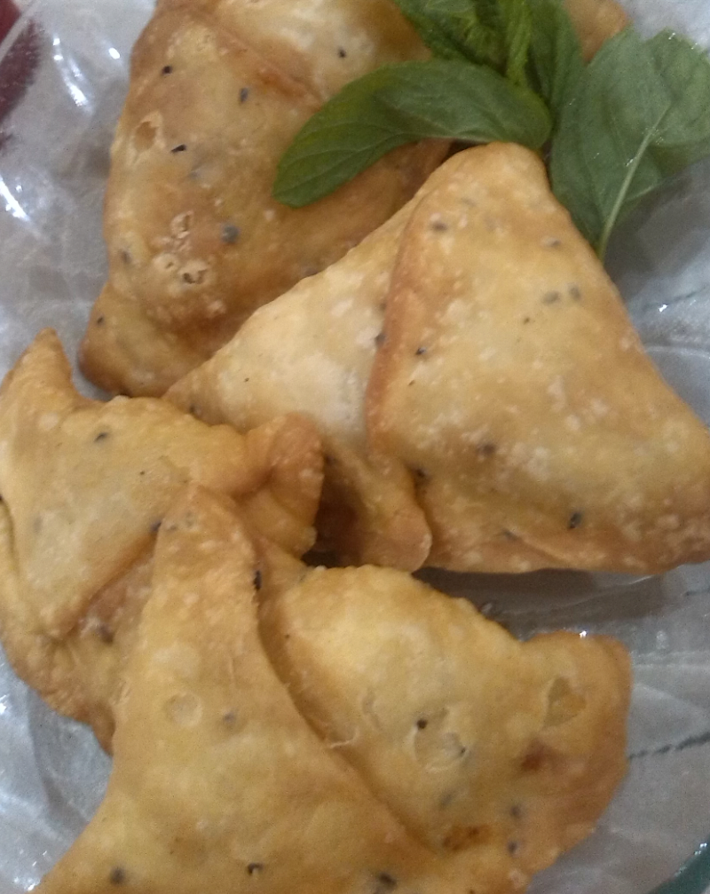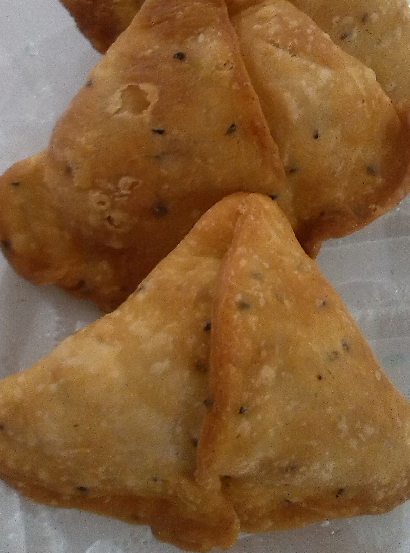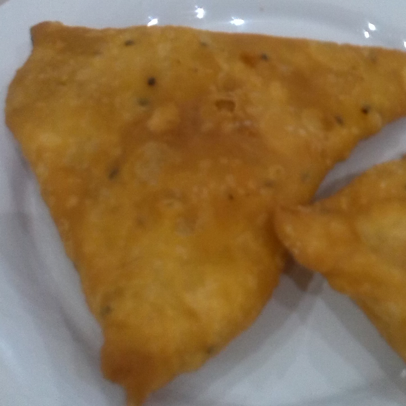 تاخذين كورة من العجين وتفردينها واقسميها بالوسط يصير عندك نص دائرة سويها مثلث واحشيها وقفليها زين واقليهااا عالطووووول ..بالعافية يارب
