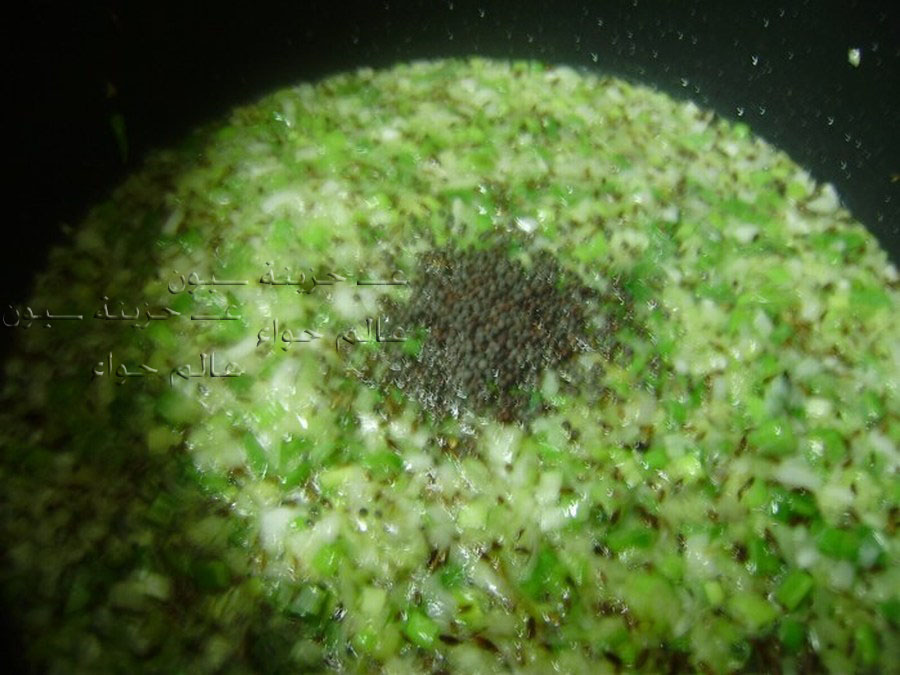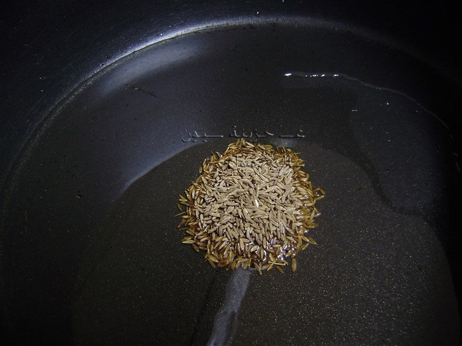 نضع الزيت في القدر ونحمر فيه الكمون الحب حتى يطلع له صوت