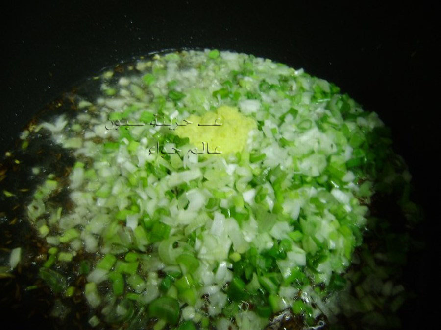 نضيف عليه البصل الأخضر والزنجبيل والخردل ونقلب 3 دقائق