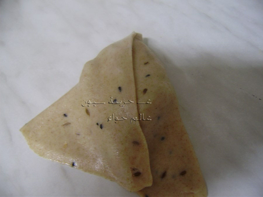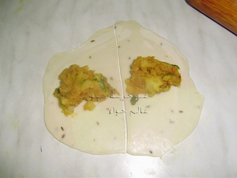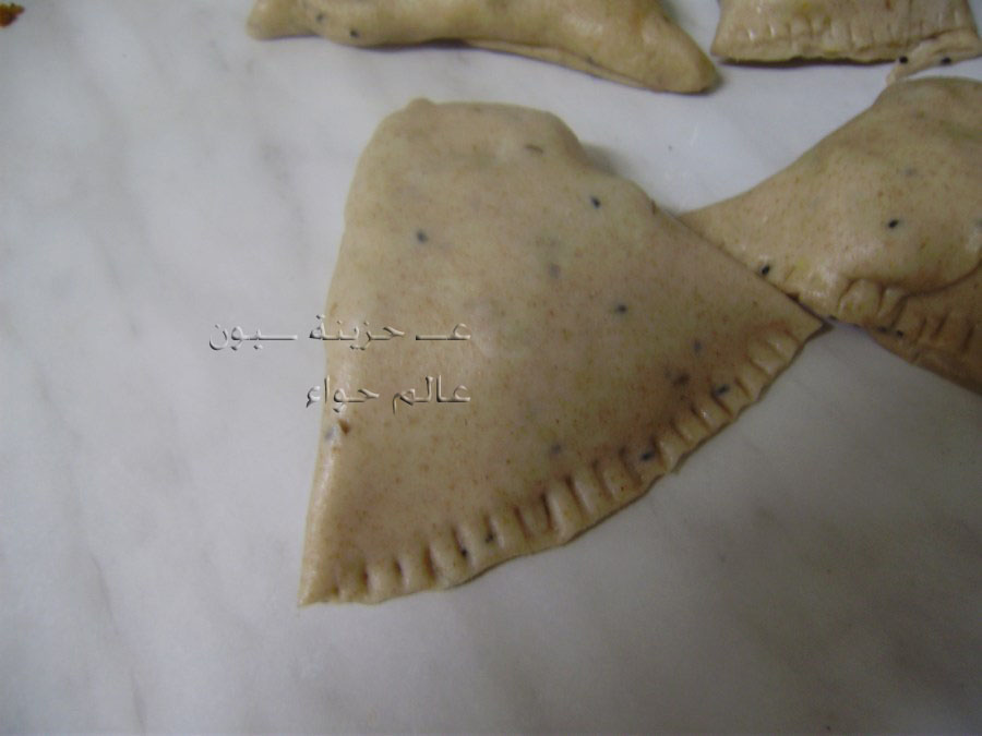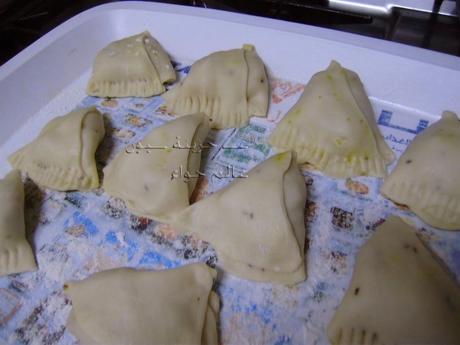 ونمسك نص الدائرة من طرفي القطر ونرفع طرف ونغطي به الحشوة ونلف الطرف الثاني على الأول ونختم العجينة من تحت ( الطرف المفتوح ) بالشوكة ونزينها بالقطاعة ونتخلص من العجين الزائد بيصير عندنا شكل مثلث