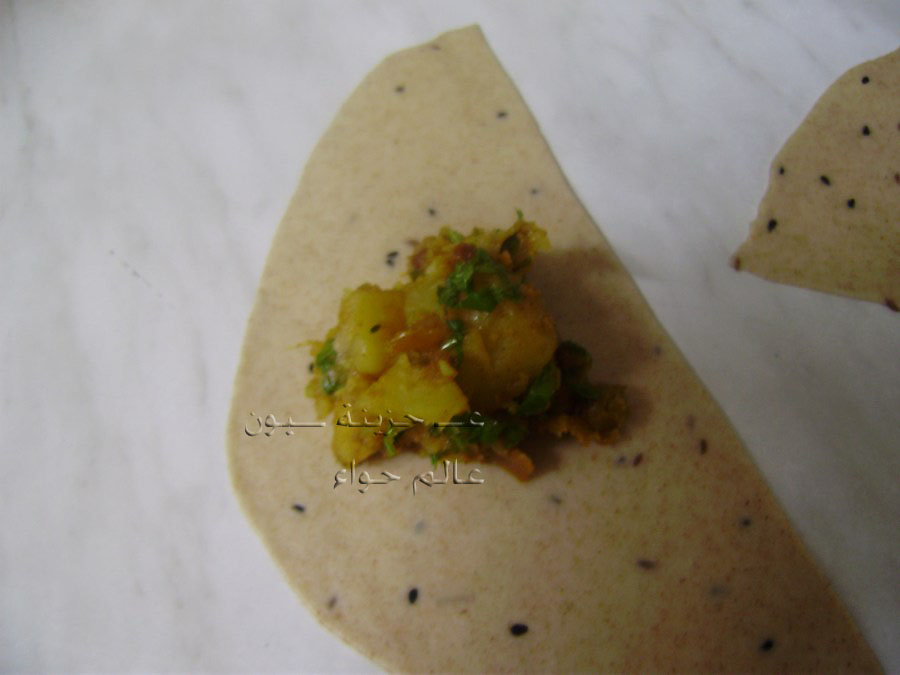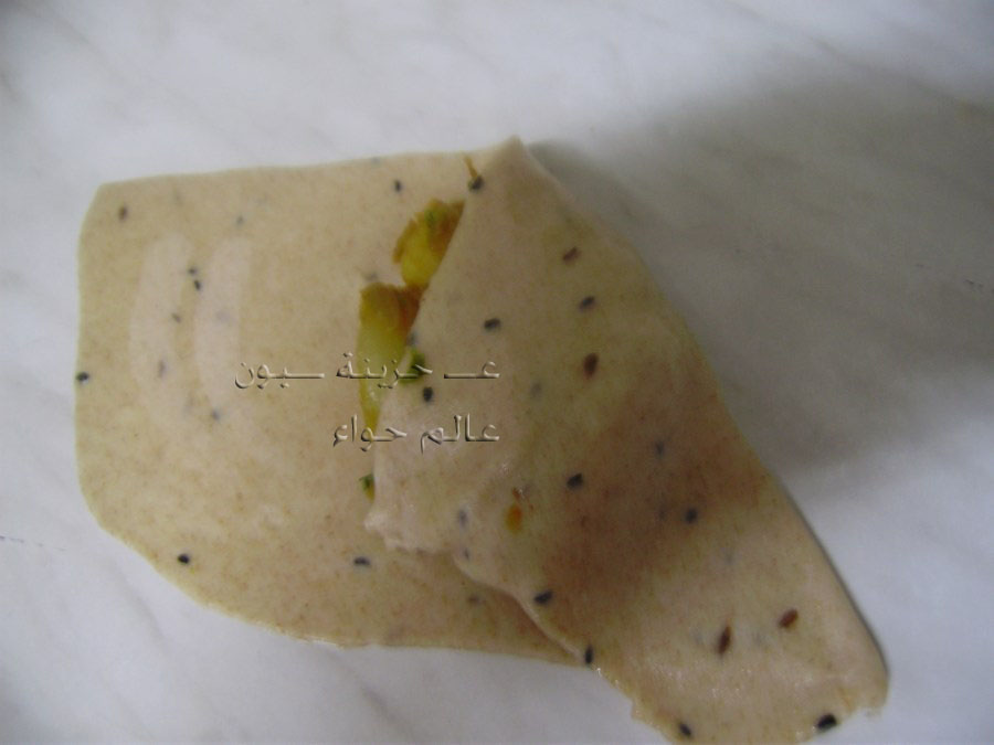 نقسم الدائرة بالنص ونبلل الأطراف بالماء نحط الحشوة بالوسط