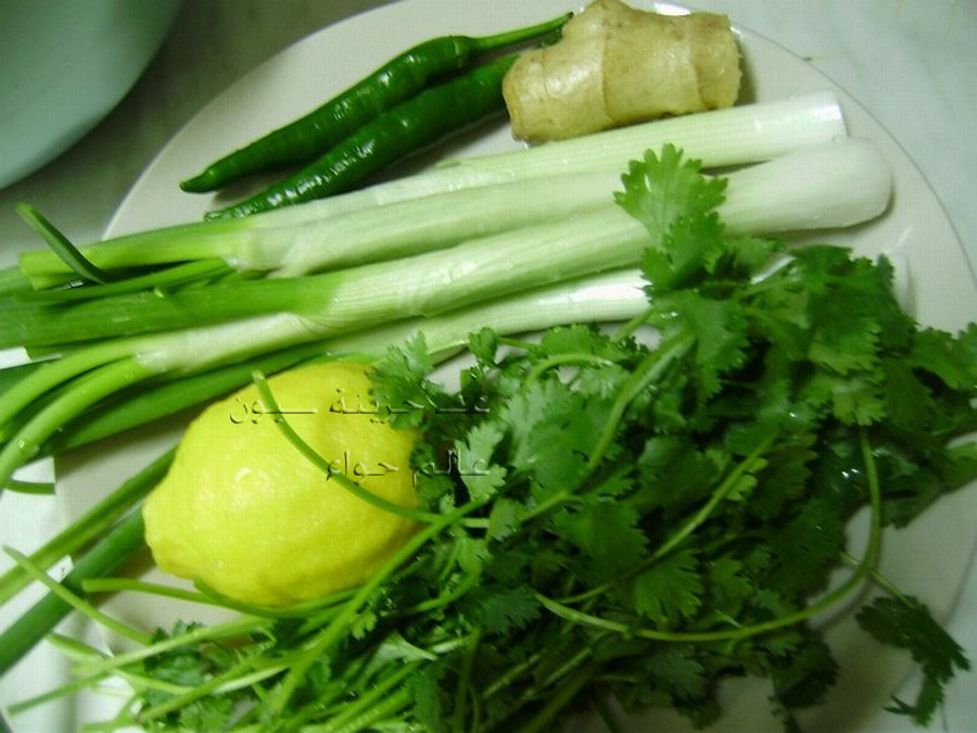 ثم نضيف الفلفل الأخضر والبهارات ونقلب ونتركه مغطى على النار دقيقة ثم نقلب و نضيف عصير الليمون ونقلب ونرفعه عن النار ونضيف الكزبرة الخضراء ونقلب ونتركه يبرد