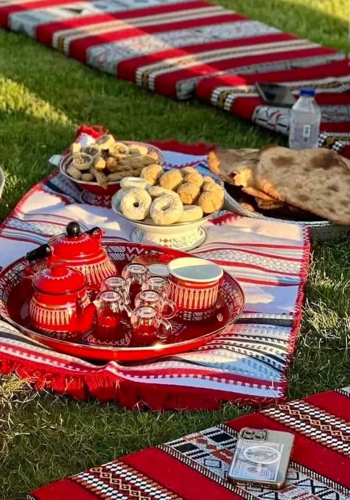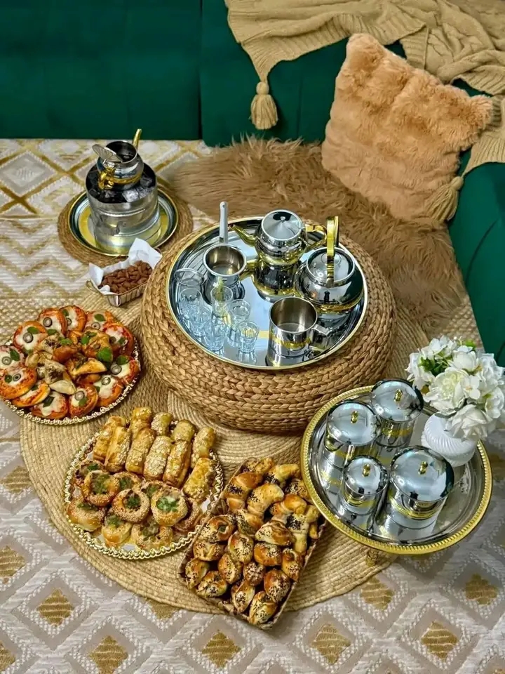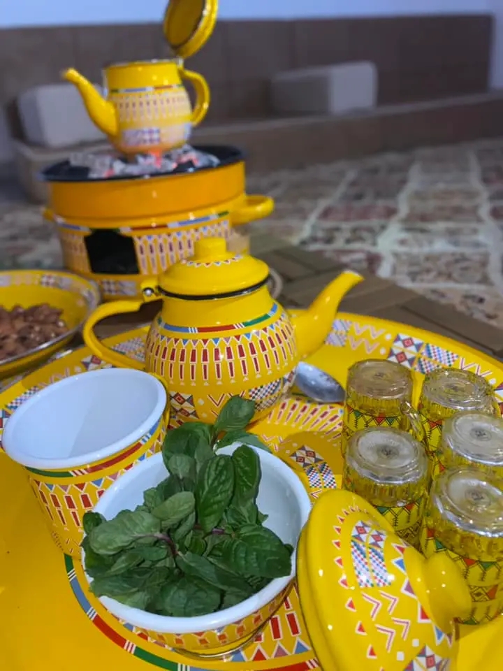 نحضر السفرة وفيها اباريق الشاي وكاسات وملعقة وعلب لحفظ الشاي والسكر والنعناع حيث يضاف النعناع والمعطرات للشاي وهى اعشاب طبيعية حسب الرغبة مثل البردقوش وغيره