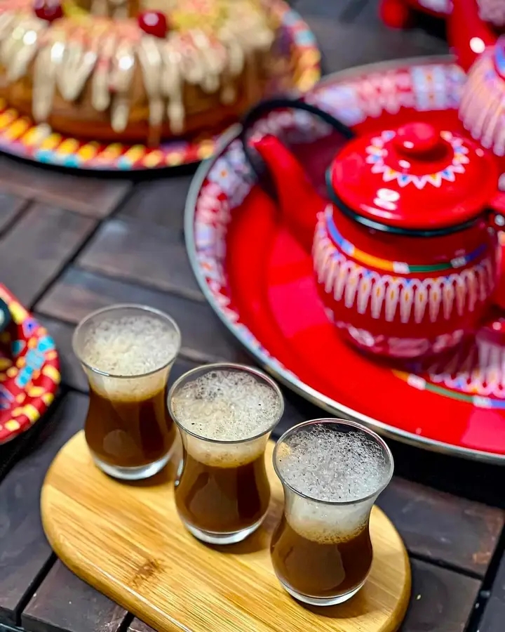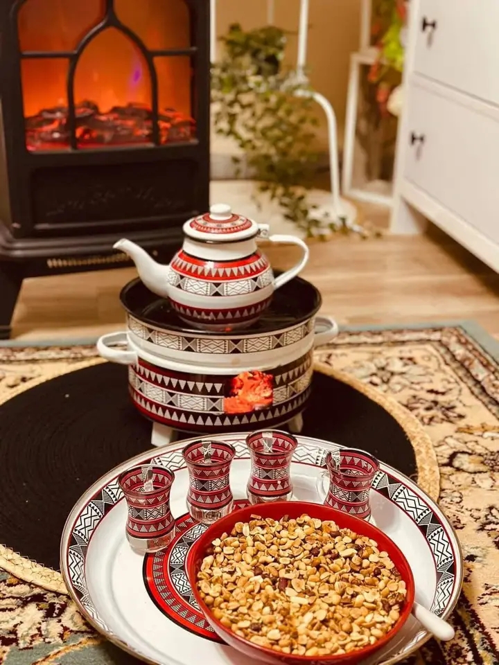 بينما نحن نفضل الأحمر ونضيف الفول السوداني وتنطق (الكاكاوية) في ليبياويقدم مع الشاي الحلويات والموالح والمكسرات ويحلو الحديث والضحك وسرد الذكريات....