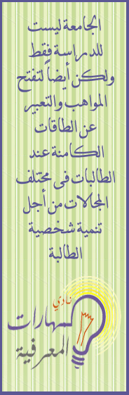 ويكون عليها هالكلام ( أن الجامعة ليست للدراسة فقط ولكن أيضاً لتفتح المواهب والتعبير عن الطاقات الكامنة عند الطالبات فى مختلف المجالات من أجل تنمية شخصية الطالبة. )