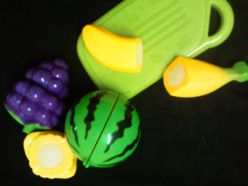والطفل يقطعها بالسكين ويرجع يجمع اجزاء الفواكه مع بعض