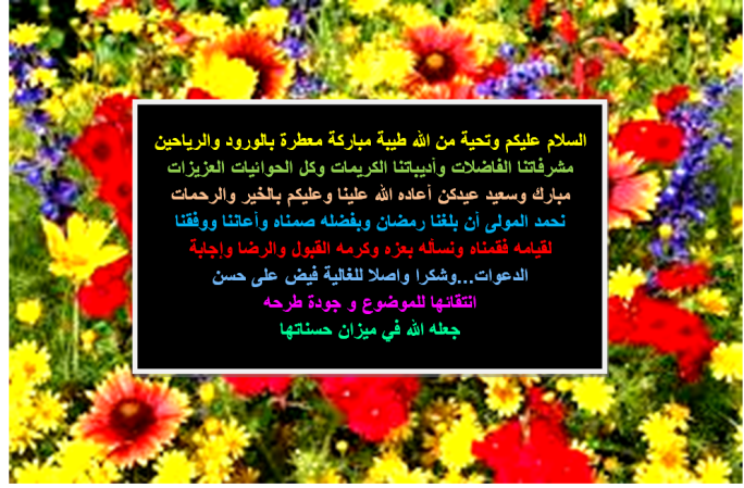 فيض الحبيبة كل عام وانت بالف خير وسعاده وكل عام وكل زهرات الواحة بخير وسعادة وفرحة أعاد الله علينا جميعا العيد ونحن بأحسن حال وشكرا موصولا من القلب لكلمات معايدتك الرائعة فيض الغالية