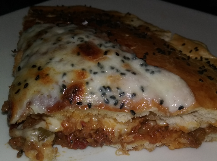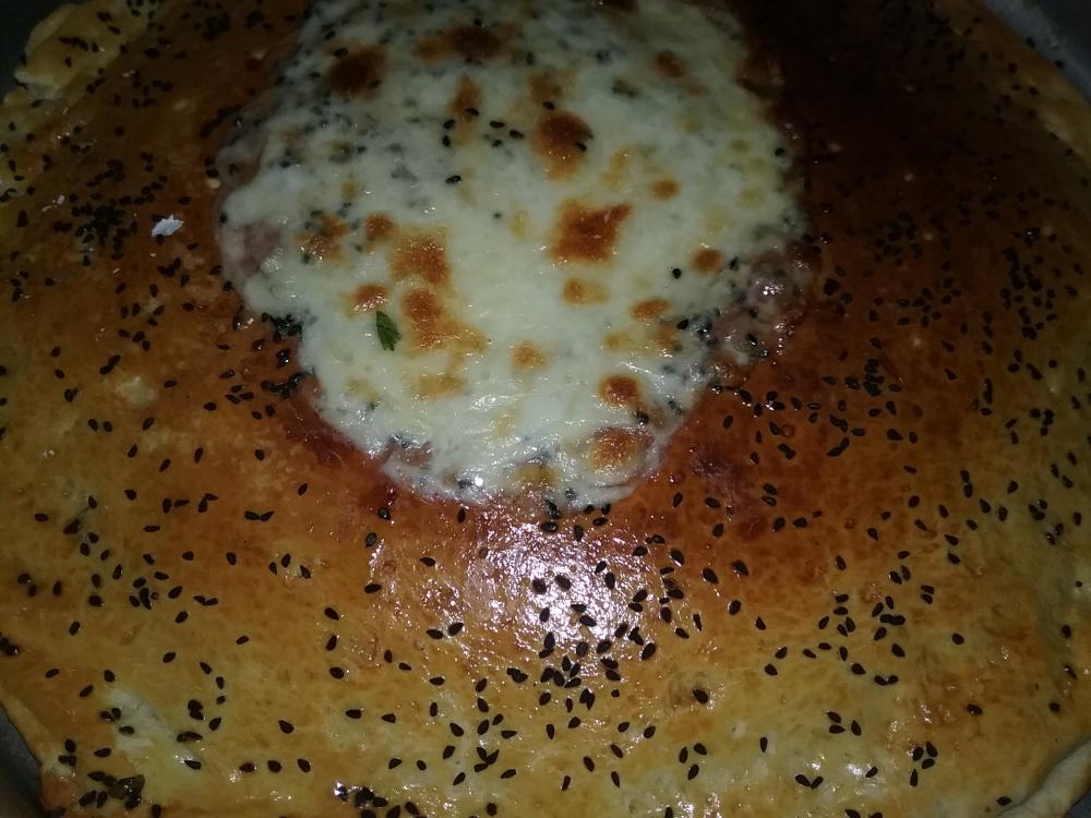 وتخرجي الهواء من العجينه بالضغط عليها تقسمي العجينه نصفين النصف الاول تفرديه بالصحن وتسوي فيه ثقوب بالشوكه تحطي شوي موزاريلا وحشوه المفروم وفوق حشوة المفروم كمان موزاريلا تجيبي العجينه الباقيه تفرديها بالشوبك وتغطي فيها الحشوه وتلصقي الاطراف وتعملي كمان فيها ثقوب بالشوكه ملاحظه لما تحطي الحشوه لا تعملي منها للاطراف عشان نلصق طرف العجينه الي تحت مع العجينه الي فوق وندهن الواجهه بصفار بيضه ونرش حبه البركه او سمسم وندخلها فرن ساخن من تحت ثم فوق ولما يحمر فوق نخرجها نرش بقيه الموزاريلا للوسط ونرجعها لما تسيح الجبنه وتحمر شويه خرجيها وقطعيها طعمها جميل واذا اردتم زياده كميه المفروم والموزاريلا براحتكم