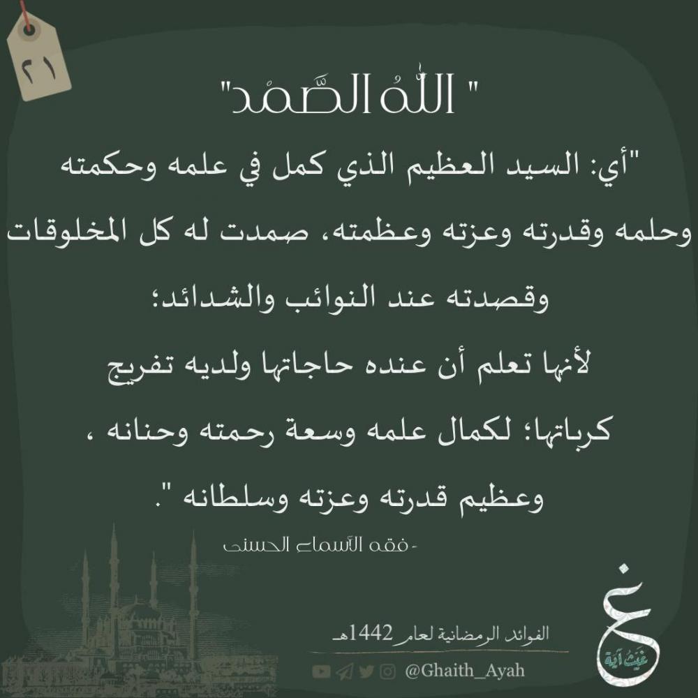 السيد العظيم الذي كمل في علمه وحكمته وحلمه وقدرته وعزته وعظمته، صمدت له كل المخلوقات وقصدته عند النوائب والشدائد؛ لأنها تعلم أن عنده حاجاتها ولديه تفريج كرباتها؛ لكمال علمه وسعة رحمته وحنانه ، وعظيم قدرته وعزته وسلطانه ".