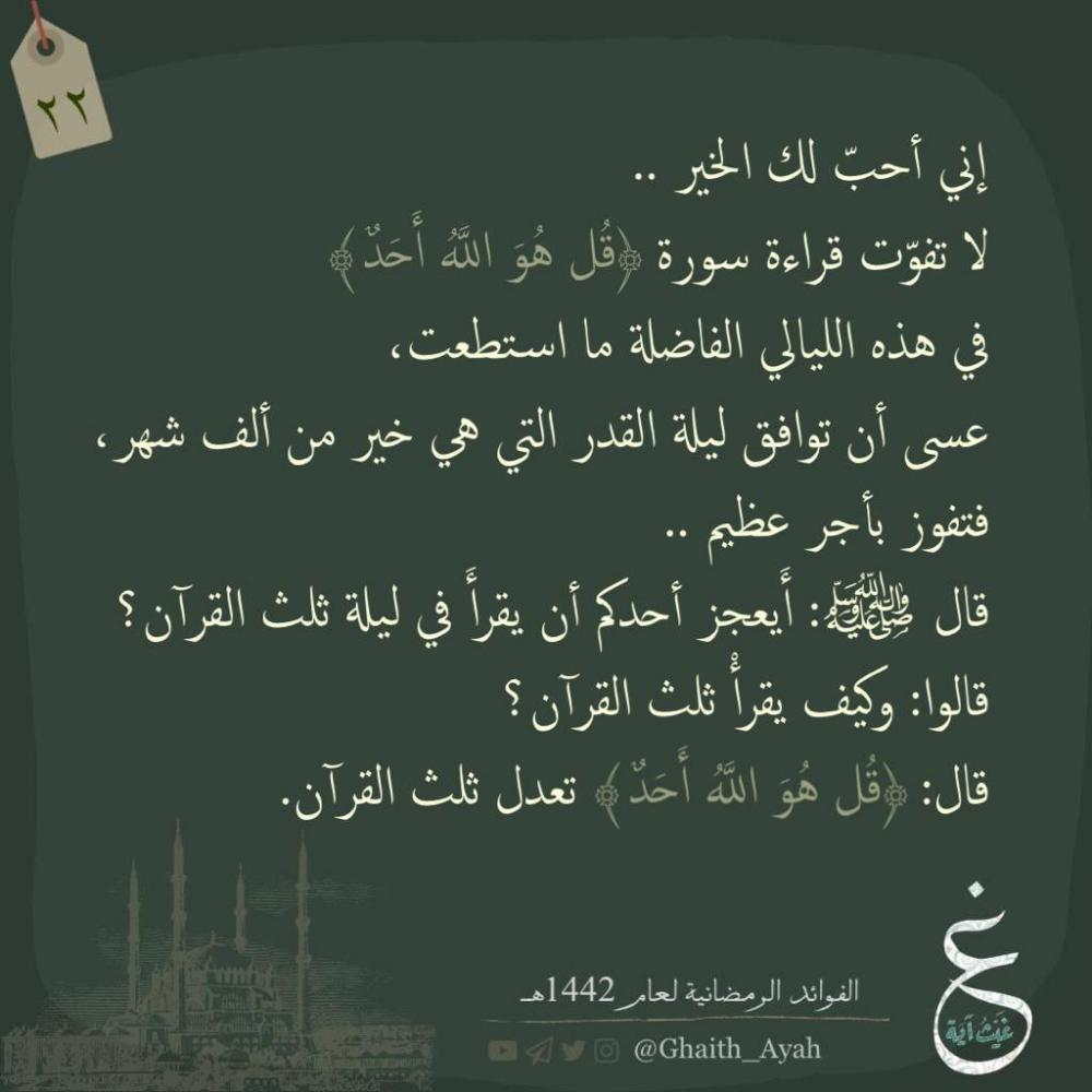 إني أحبّ لك الخير .. لا تفوّت قراءة سورة (قل هو الله أحد) في هذه الليالي الفاضلة ما استطعت، عسى أن توافق ليلة القدر التي هي خير من ألف شهر، فتفوز بأجر عظيم ..