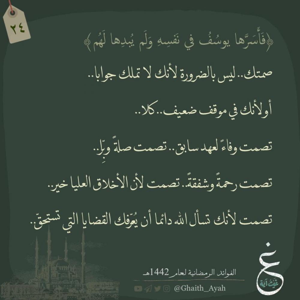 صمتك.. ليس بالضرورة لأنك لا تملك جوابا.. أو لأنك في موقف ضعيف، كلا.. تصمت وفاءً لعهد سابق.. تصمت صلةً وبِرّا.. تصمت رحمةً وشفقةً.. تصمت لأن الأخلاق العليا خير.. تصمت لأنك تسأل الله دائما أن يُعرّفك القضايا التي تستحقّ.