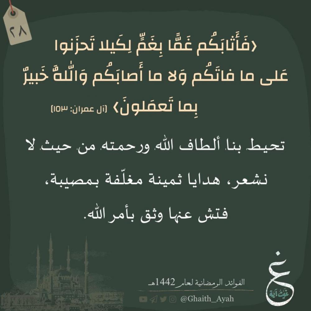*﴿فَأَثابَكُم غَمًّا بِغَمٍّ لِكَيلا تَحزَنوا عَلى ما فاتَكُم وَلا ما أَصابَكُم وَاللَّهُ خَبيرٌ بِما تَعمَلونَ﴾*
