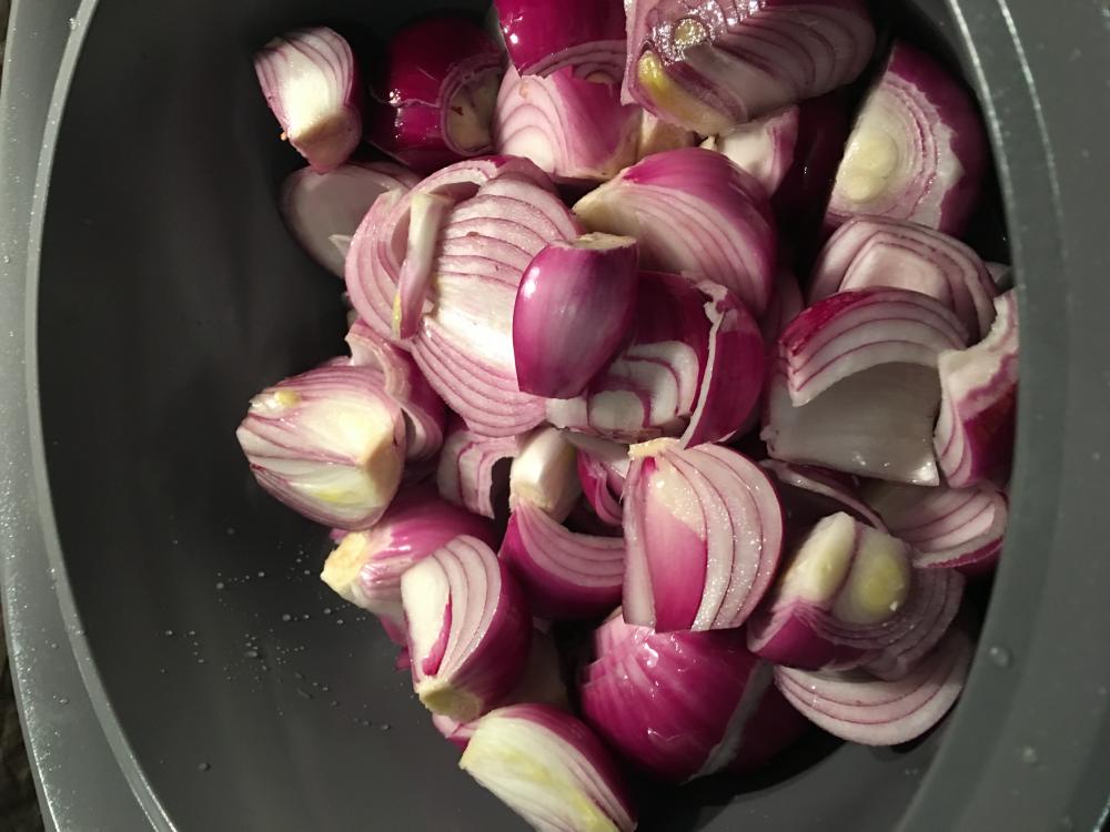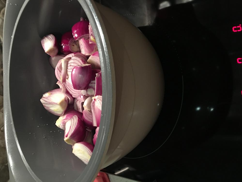 نقطع البصل ارباع طبعا كميه كبيييره مثلا 15 حبه بصل مقابلها 30 او25 حبه طمام وراس ثوم كامل نحط البصل في القدر ونحط عليه زيت ونحمسه خفيف مررره. مو كثير