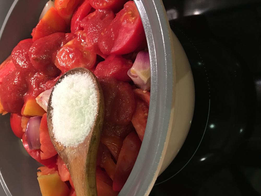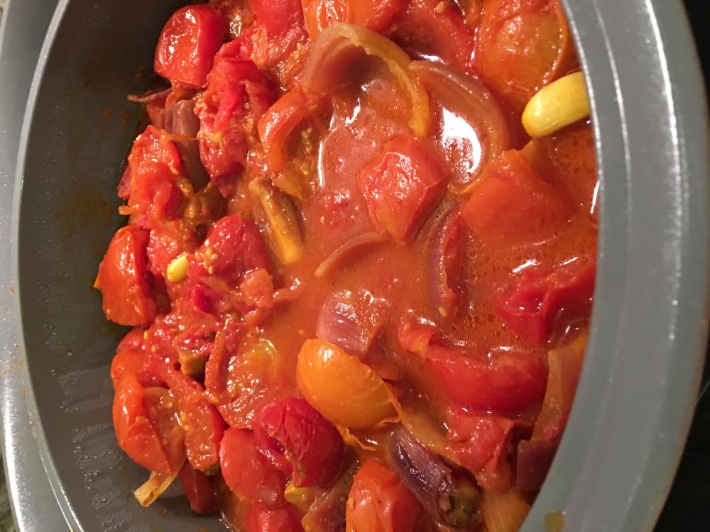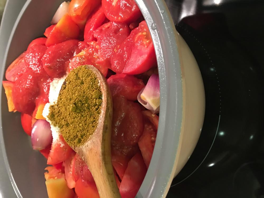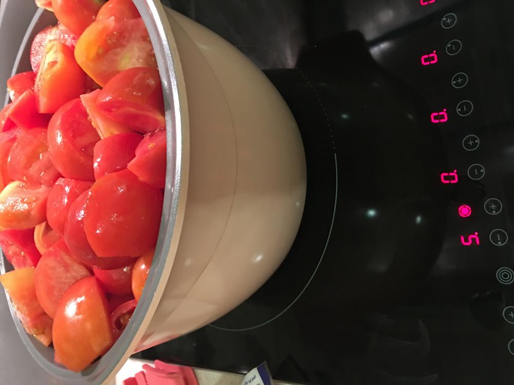 ننزل عليه الطماط ونفس الشي مقطع ارباع ونضيف ملعقه كبيره ملح وملعقه بهارات مشكله وعلبه معجون طماط وارخيي النار واغطيها ونخليها تطبخ قرابة الساعه