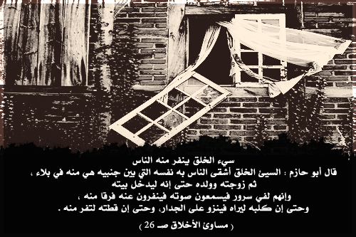 قال أبو حازم:السيئ الخلق أشقى الناس به نفسه التي بين جنبيه هي منه في بلاء،ثم زوجته وولده حتى إنه ليدخل بيته وإنهم