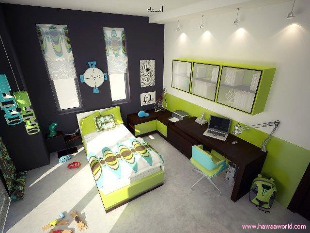 اما اذا الغرفه للشباب والمراهقين الكبار فالتفاحي الهادئ او الصارخ يناسبهم والدمج مع الالوان الصارخه الثانيه بطريقه غير طفوليه سنكون رائعه كديكور جداري منقوش او مطبوع او بخطوط مع ألوان اخرى هادئه كالبيج او البني او الاحمر الغامق ..ومنهم من يحب دمجه مع التركواز ..