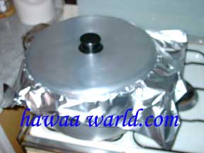 نغطي سطح القدر بقطعة من القصدير ثم نضع الغطاء ويجب استخدام قدر له غطاء محكم لاننا نريد ان نستخدم البخار على نار خافتة جدا لوقت طيول ..