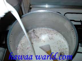 بعد ان يصل البصل إلى الاستوا ء ( طبعا لا نريد ان يتغير لونه ) نضيف اللبن ونواصل في التحريك .. اللبن في حالة توقفتي عن التحريك سيتكتل لذلك لا يجب عليك التوقف عن التحريك حتى يصل إلى درجة الغليان