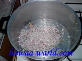 نضيف البصل بعد رفع اللحمة ونضيف الكمون ونحمس البصل على نار هادئة لكي لا يحترق
