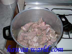 نقدح اللحمة في شوية سمنة حتى يتحول لون اللحمة نرفع الحمة ثم نظيف البصل ..