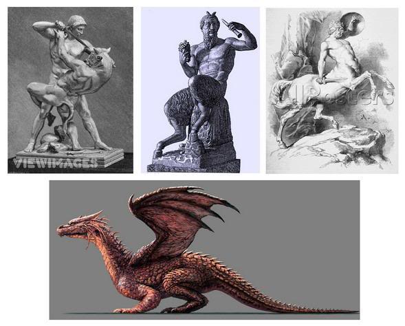 المخلوقات الأسطورية من أعلى اليمين: القنطور Centaur – البان Pan -
