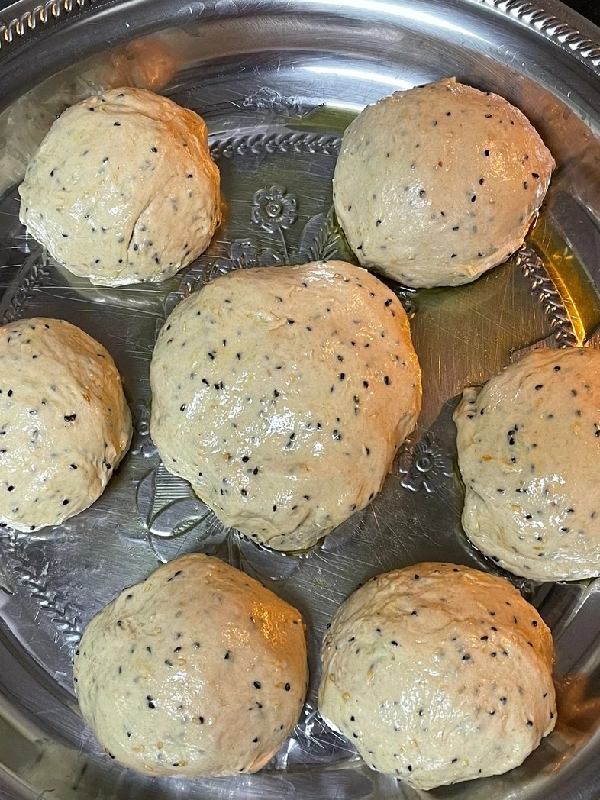 عند الانتهاء من العجن، ندهن وجه العجينة بزيت الزيتون و نتركها ترتاح لمدة نصف ساعة تقريباً