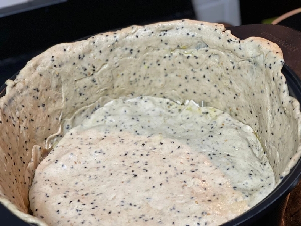 قبل وضع طبقة العجين الأخيرة نُدخل حواف طبقة العجينة الكبيرة التي تم فردها في قاع الصينية من البداية و نُراعي اغلاق وجه الصينية جيداً بالعجين كما في الصورة أدناه