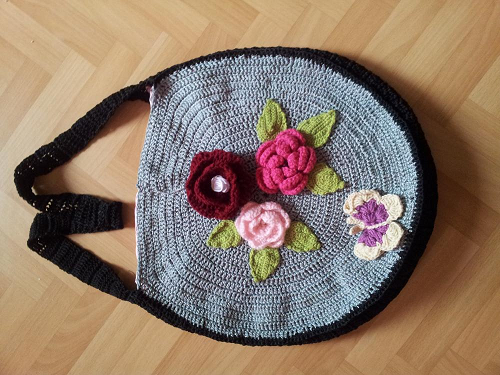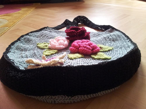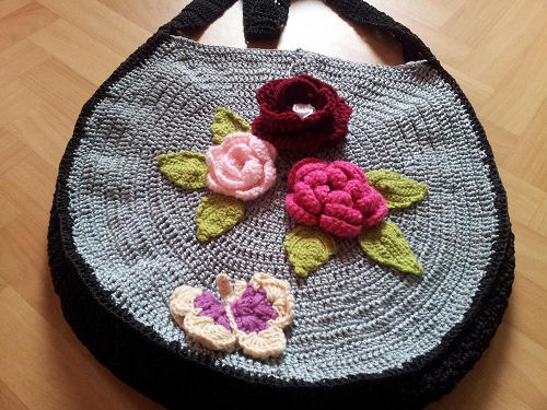 وطريقه سهله جدا ...عملت دائرتين من خيوط كروشه و كان عندي خيوط نايلون اسود سويت الكنار وخيطت الشنطه بالنار الاسود وسويت له ورود وفراشه وخيطتهم عليه