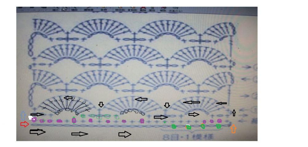 مثلا شوفي هالباترون رسمتلك عليه سهوم حتى تعرفي كيف تمشي معاه اللون الاخضر سلسله ولون موف حشو والعواميد اسود ....البدايه مع سهم الاحمروتمشي لحد سهم البرتقالي وتدخلي في سطر الثاني الي كله حشو لونه موف لحد اخر سطر كله حشو....بعدين شوفي سهم اسود بدانا بسطر الثالثحشو سلسله حشو وتعملي 5 سلاسل وتسيبي من تحت 3 سلاسل و في رابع تعملي حشو و بعده تعملي حشو سلسله حشو ....وهكذا ,وطبعا لو حفظتو الرموز بيكون سهل عليكم جدا خاصة الي الان نستعمله ....رمز عامود و حشو وسلسله و منزلقه بسسسسس تعرفو تقرو الباترون.مثلا شوفي هالباترون رسمتلك عليه سهوم حتى تعرفي كيف تمشي معاه اللون الاخضر سلسله ولون موف حشو...