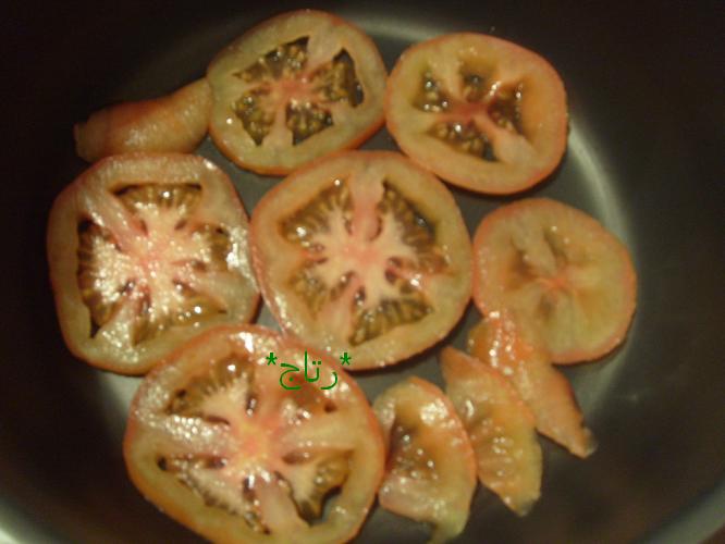 هلأ بنصف شرايح بندورة بالطنجرة ( ممكن تضيفو بطاطا و بصل )