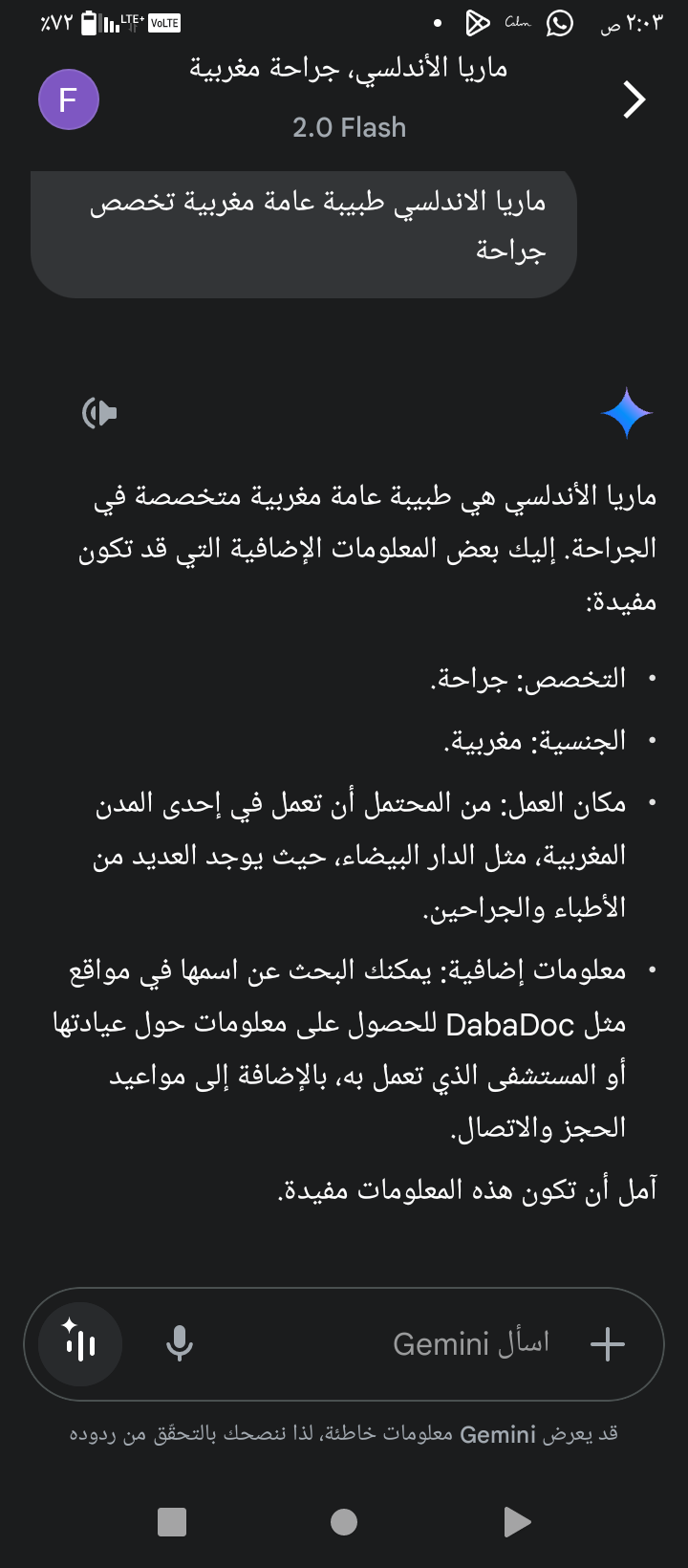 أنا اشوفها من زمان تفيدنا سالت الذكاء الاصطناعي عنها وهذا رده مع اني ماعرفها ولاتواصلت معها ولامرة بس كان لها موضوع استشارات وكنت سالتها سؤال وافادتني مايهمني وش هي بس سالت الذكاء الاصطناعي لعل يفيدكم وتروح حيرتكم سألته كذا مرة رد نفس الرد🫠 الله يوفق الجميع...وكل من يفيد محتاج...ماتوقع في أحد ماهو طبيب يقول عن نفسه طبيب وش هدفه ليكذب وفي موقع.أنا اشوفها من زمان تفيدنا سالت الذكاء الاصطناعي عنها وهذا رده مع اني ماعرفها ولاتواصلت معها...