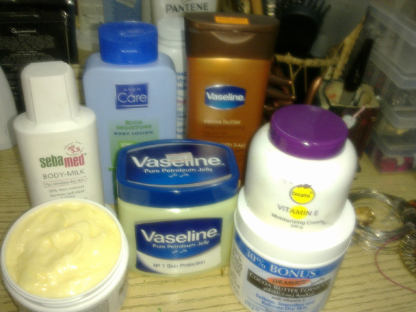 وبعدين احط كريم مرطب بيديني ورجليني مجموعة كريمات خالطتهم مع بعض اللي هي كاميل وجونسون الوردي وزيت جليسرين وشويه اسكنول ليمون