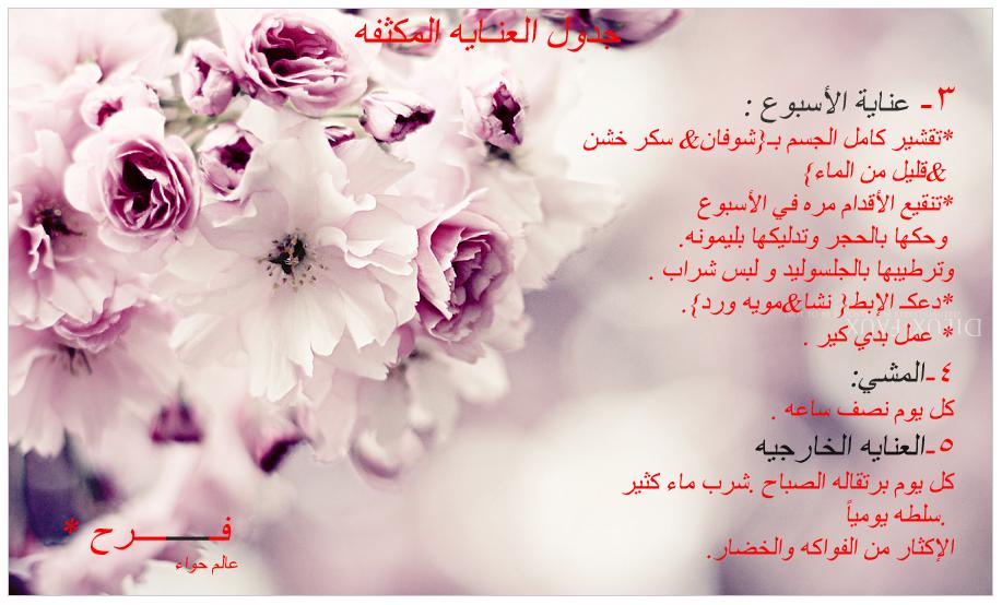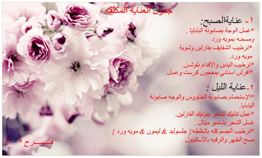 بسم الله الرحمن الرحيم تابع اليوميات اليوم الاحد 2-1-2011 اليوم الثاني +++++++++ مساء الخير للجميع أول شي انا أضفت شي جديد وهو (الخلطة الصابونية ) وباستخدمها يوم وترك ان شاء الله اليوم خطر على بالي أسويها لأن اغراضها متوفرة عندي وان شاء الله تعطي نتيجه حلوة.. وهذي صورتها 20110102599 بالنسبة لليوم الصباح غسلت وجهي بالمنظف رشيت موية ورد وبعدها الكريم المرطب لجسمي حطيت خلطة الجسم بعد العصر اتروشت بالخلطة الصابونية وبعدها الشاور جل وبعدين رطبت جسمي بكريم بالمرز يديني ورجليني بلوشن مرطب شعري طبعا اليوم راحه لوجهي حطيت ماسك مكون من (عسل + قرفه + موية ورد ) تركته ربع ساعه وبعدين غسلته ورشيت موية ورد النظام تبع الاكل والرياضة ماشية عليه تمام والفيتامينات والحديد كمان اخذتها اممممم تقريبا هذي الأشياء تبع كل يوم وبالليل طبعا الغسول والمرطب وخلطة الهالات ... مع السلامة ياحلوين ..:27: سبحانك اللهم وبحمدك اشهد ان لا اله الا انت استغفرك وأتوب اليكبسم الله الرحمن الرحيم تابع اليوميات اليوم الاحد 2-1-2011 اليوم الثاني +++++++++ مساء...