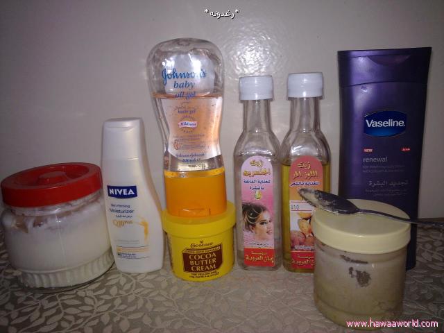 ارطب جسمي:- جلسرين +لوز مر+جنين القمح +6كبسولات فيتامين اي+لوشن نيفيا لشد الجسم +لوشن دوف لشد +الجسم +فير أند وايت من جرجنز +فازلين بزبدة الكاكو