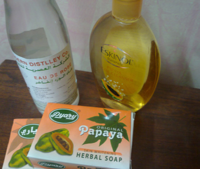 وبعد ساعه بسبح بصابونه البابايا +سنفره كاب + الظهر والبطن خلطه حور للازمات وعلى الركب والاكواع بحطه