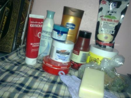 خلطة للسترتش مارك وزعتها بعلبة الاسكينول وجرجنز وعلبة موية الورد عشان اسهل علي في الاستخدام