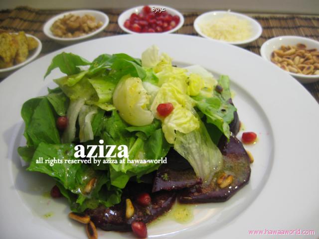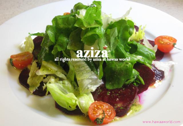 اما اذا كان لديك ضيوف فيفضل تقطيع الشمندر لمكعبات ووضعه بالصحن الكبير ثم فوقه الخس والجرجير