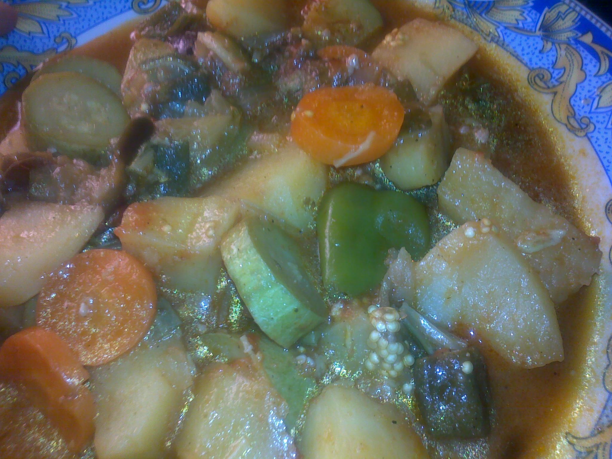 والخضار::- حبتين بطاطس مقطعه مكعبات وسط , حبتين كوسه مقطعه بنفس حجم البطاطس , 1باذنجان وسط برضه مقطعه بنفس الحجم(اختياري) ,, فلفل رومي حبه مقطعه طوليا ,, قبضتين يد من الباميه ,, جزر حلقات وسط مو سميكه ولا رفيعه ,, قرن او اثنين فلفل اخضر حار..
