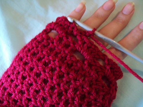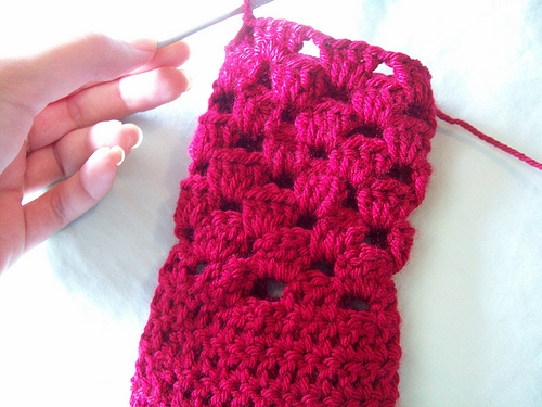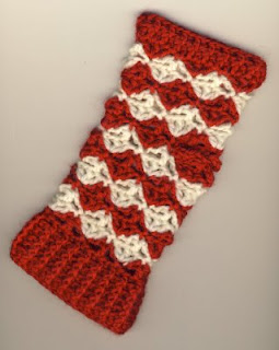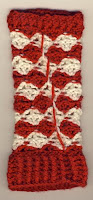 The cuff uses the lovely Oval Windows pattern, bordered at top and bottom by a row of single crochet stitches. The Stacked Arches pattern begins in row 7. Arches are added to shape the hand and thumb.