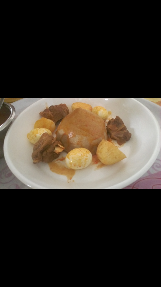 في طنجرة تانية نضع حوالي لتر و نص ماء و نخليه يغلي .. نضيف عليه كيلو دقيق شعير و ذرة ملح و نخليه على نار هادئة حوالي نصف ساعة ... نجيب العصا الخشبية او ما تسمى بالمغرف في ليبيا ... و نحركها لحتى نتحصل على عجينة متماسكة... نكورها في الصحن و نضع حولها اللحم و البطاطا المطبوخة بالملح و البيض المسلوق... و تقدم بجانب الليمون و الفلفل الأخضر الحار...