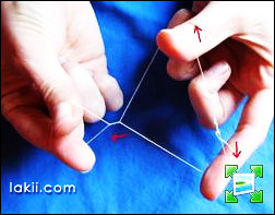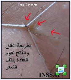 بالشد يمرر الخيط على البشرة بطريقة الفتح والغلق كالمقص وبشكل سريع , الايدين تكون لتحت عكس الصورة