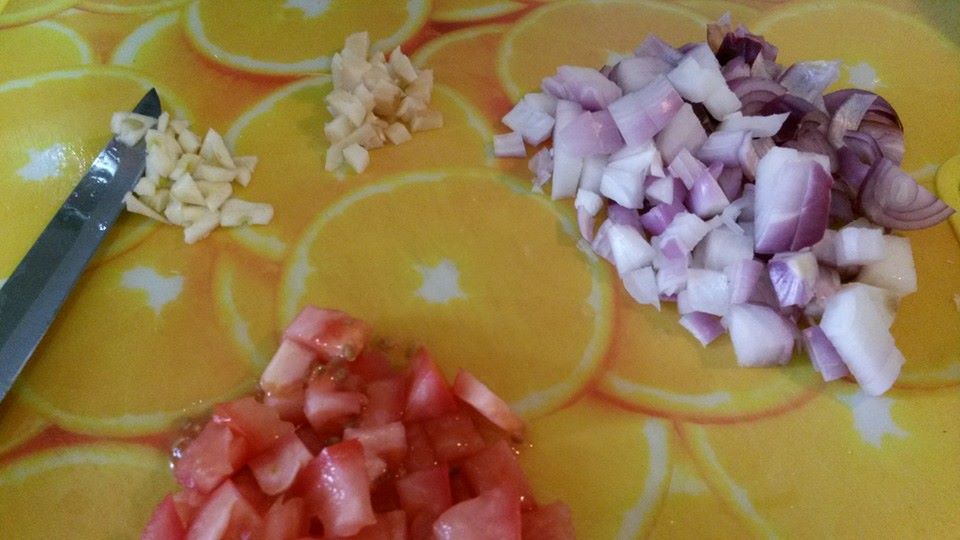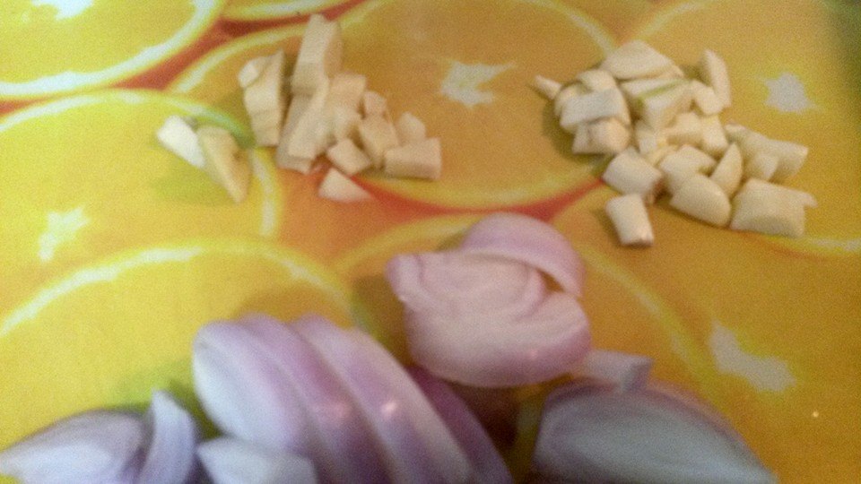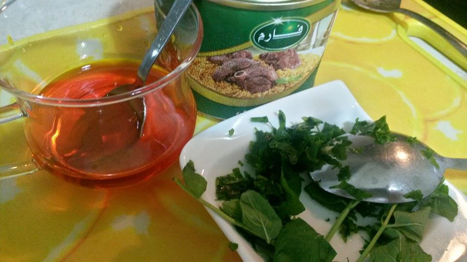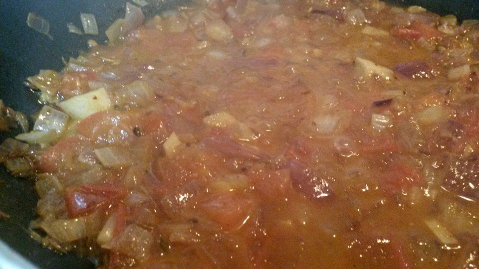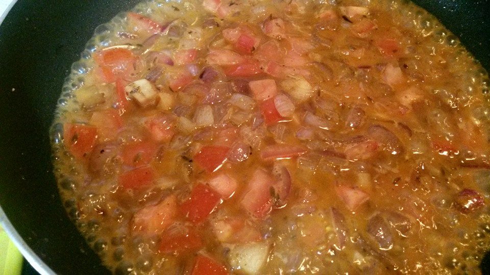 ملعقتين زيت ثم يضاف البصل و الثوم و الزنجبيل و الفلفل يقلبو جيدا الى أن يتحمر البصل ثم تضاف الطماطم + قليل من النعناع و الكزبرة و يترك على النار لمدة عشر دقائق