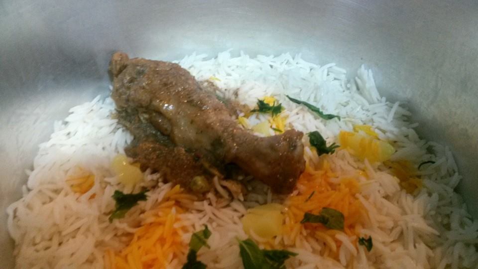 يوضع طبقة من الأرز + ملعقة سمن صغيرة + قليل من الكزبرة و النعناع + لون الزعفران و قطعه من الدجاج مع الخليط .