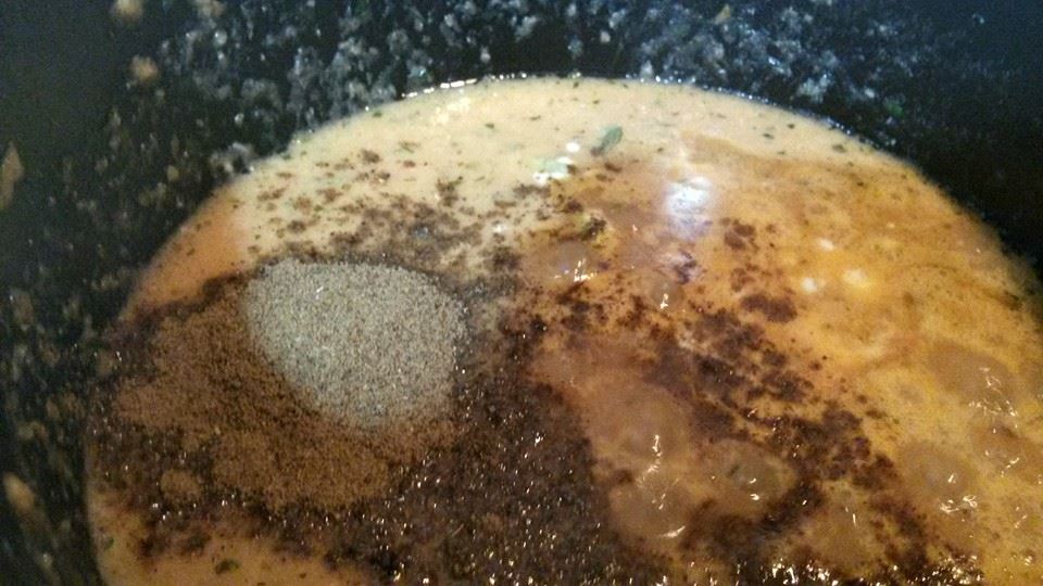 في نفس القدر يقلب حبتين من كل من هيل و فلفل اسود و قرنفل و قطعة قرفة ثم يضاف الخليط +ملح + ماجي + بهارات الجراماسالا أو بهارات البرياني والدجاج و الزبادي