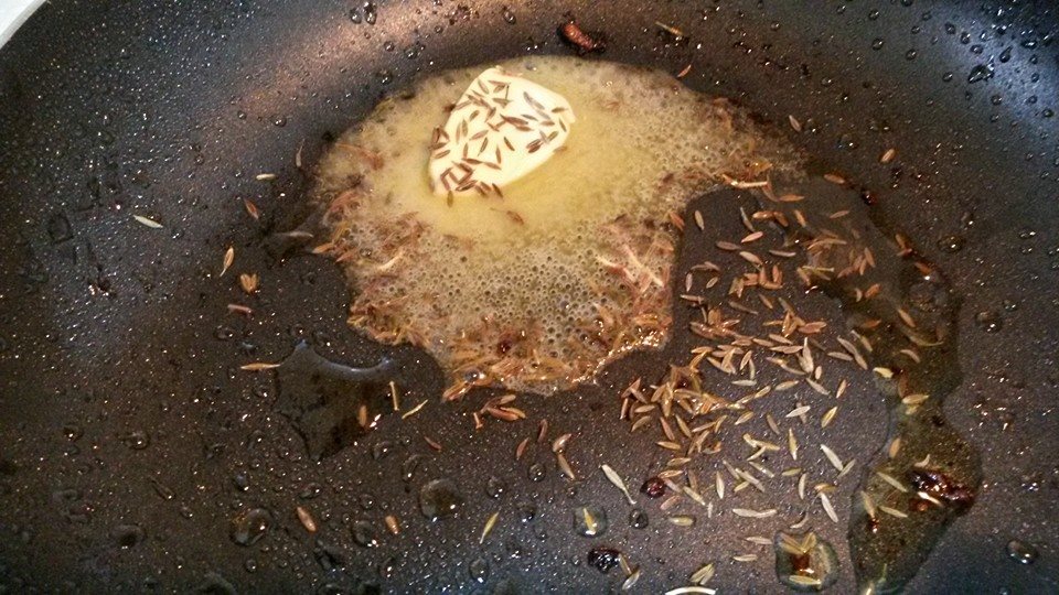 في نفس القدر يوضع ملعقة زبدة صغيرة ثم يضاف الكمون +البصل + الزنجبيل + الثوم + ربع كوب ماء ثم تضاف الكزبرة + شطه + الفلفل + الطماطم يترك على النار لمدة 10 دقائق ثم يطحن في الخلاط .