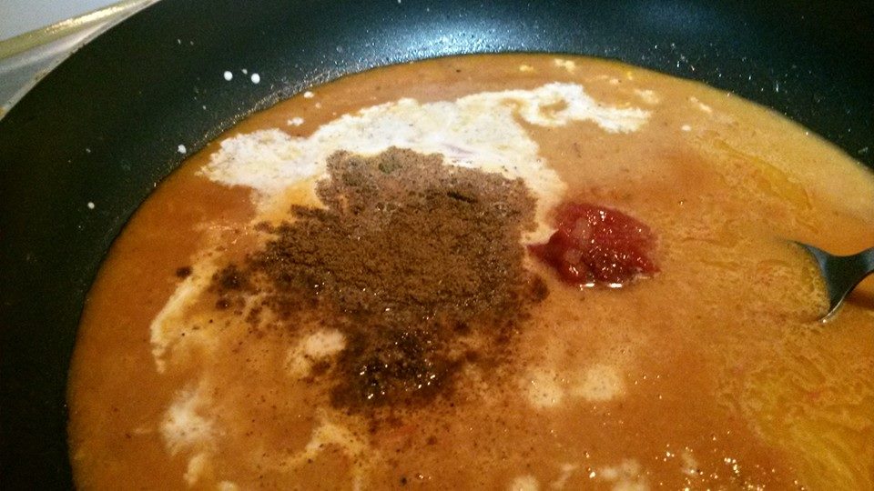 في نفس القدر تضاف الزبدة ثم الخليط + قليل من الماء اذا لزم + الدجاج + الصلصه +السكر+ الكريمة + بهارات جراماسالا