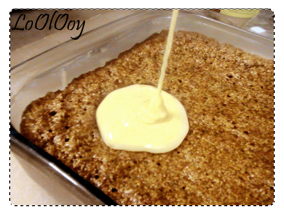 ثم نضع عليها المقادير الجافة ونخلط جيدا حتى تتجانس ثم تصب في الصينية وتدخل الفرن حتى النضج