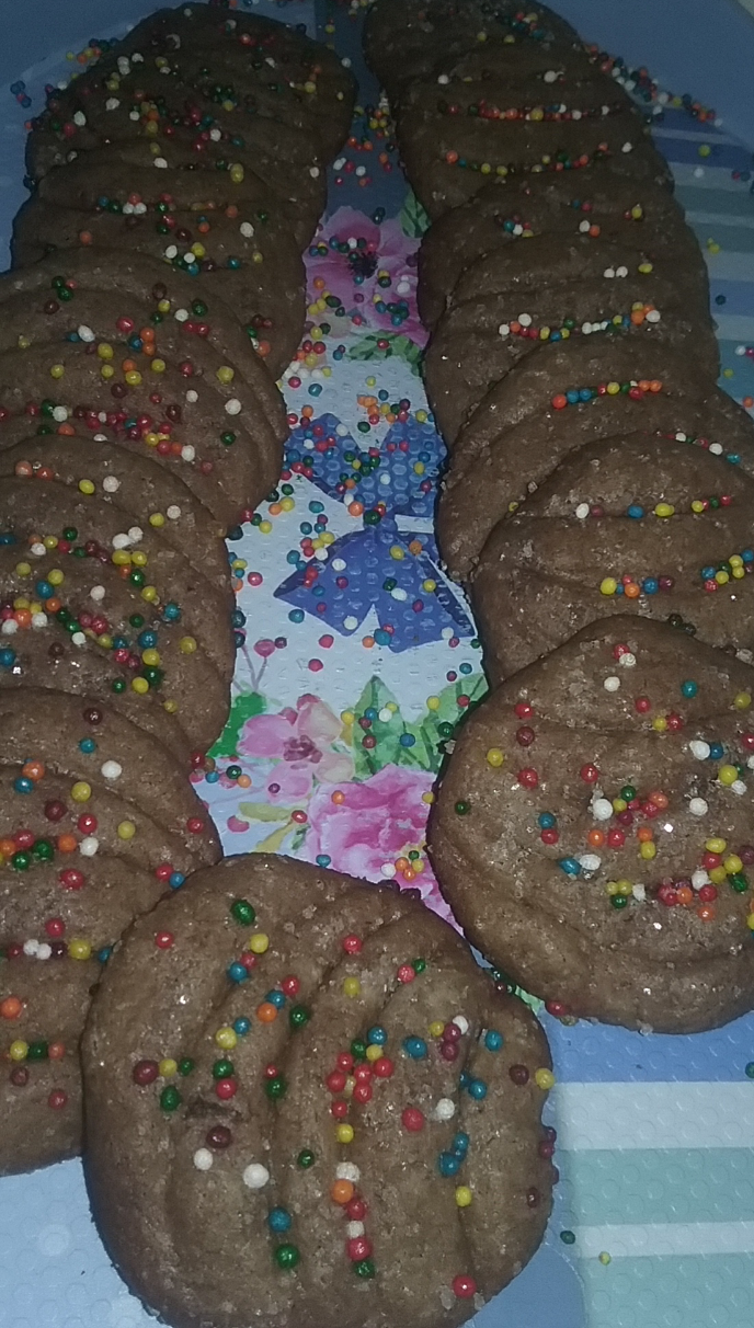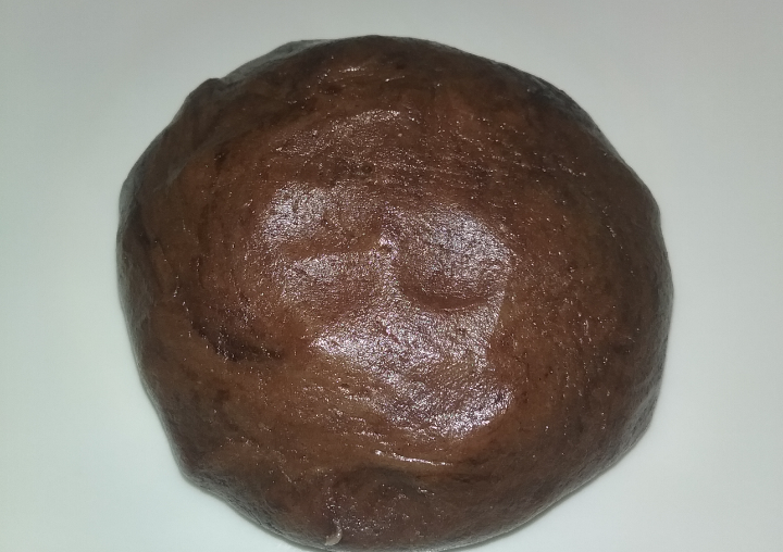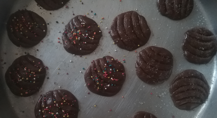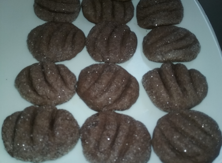 في زبدية نحط البيض والسكر والزيت والفانيليا بالمشبك اليدوي ثم نضيف الدقيق والبكنج بودر والكاكاو ونحرك بالمشببك اليدوي ثم نلم العجينه بيدنا ونبدا بالتشكيل